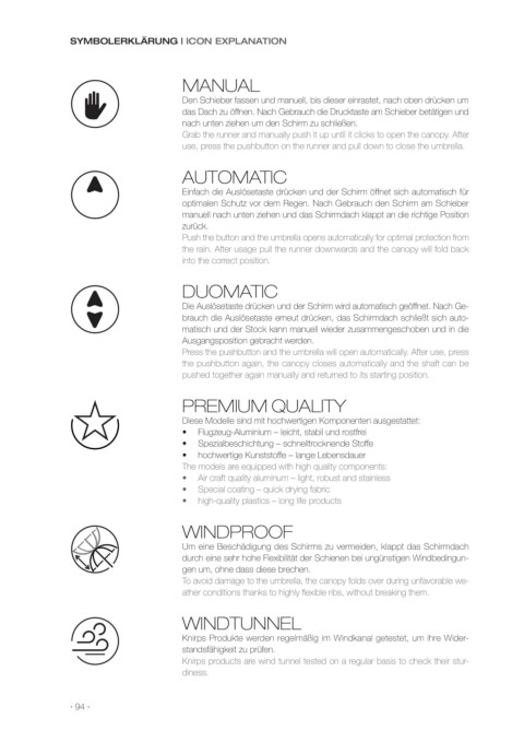DUOMATIC Press the pushbutton and the umbrella will open automatically. After use, press