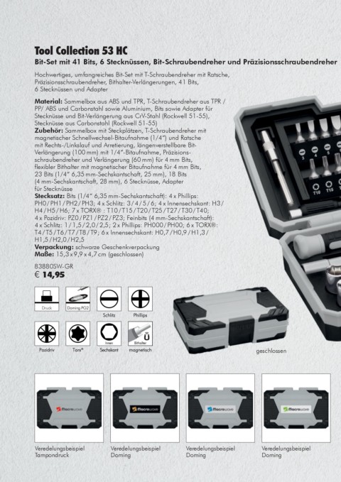 4 x Schlitz: 1 / 1,5 / 2,0 / 2,5; 2 x Phillips: PH000 / PH00; 6 x TORX®: