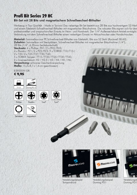 Material: Sammelbox aus PP, Schnellwechsel-Bithalter aus Edelstahl, Bits aus S2 Stahl (Rockwell 58-60)