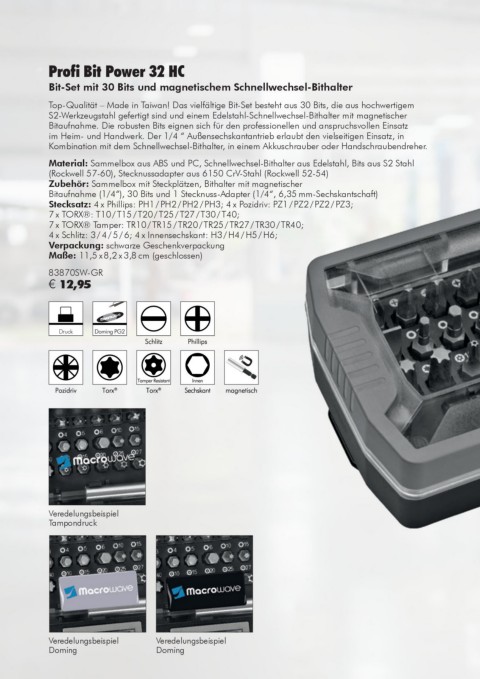 Material: Sammelbox aus ABS und PC, Schnellwechsel-Bithalter aus Edelstahl, Bits aus S2 Stahl