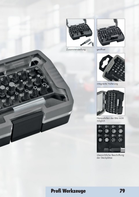 Material: Sammelbox aus ABS und PC, Schnellwechsel-Bithalter aus Edelstahl, Bits aus S2 Stahl
