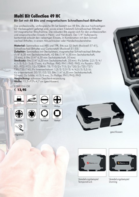 Material: Sammelbox aus ABS und TPR, Bits aus S2 Stahl (Rockwell 57-61),