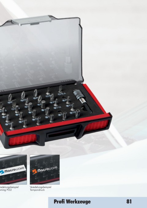 Stecksatz: 4 x Phillips: PH1 / PH2 / PH2 / PH3; 4 x Pozidriv: PZ1 / PZ2 / PZ2 / PZ3;