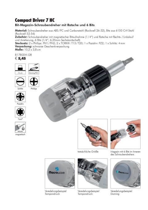 und Arretierung, 6 Bits (1/4“, 6,35mm-Sechskantschaft) Stecksatz: 2 x Phillips: PH1 / PH2; 4 x TORX : T10 / T15 / T20 / T25; 2 x Schlitz: 5 / 6 mm;