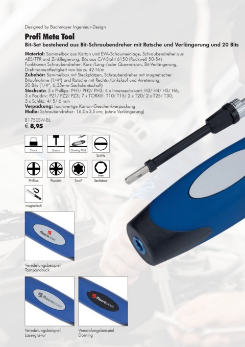 Stecksatz: 3 x Phillips: PH1/ PH2/ PH3; 4 x Innensechskant: H3/ H4/ H5/ H6;