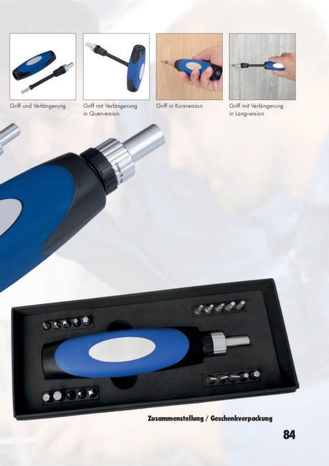 Bitaufnahme (1/4“) und Ratsche mit Rechts-/Linkslauf und Arretierung, Griff und Verlängerung Griff mit Verlängerung Griff in Kurzversion Griff mit Verlängerung
