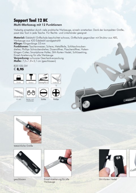 Funktionen: Taschenmesser, Schere, Metallfeile, Schlitzschrauben-