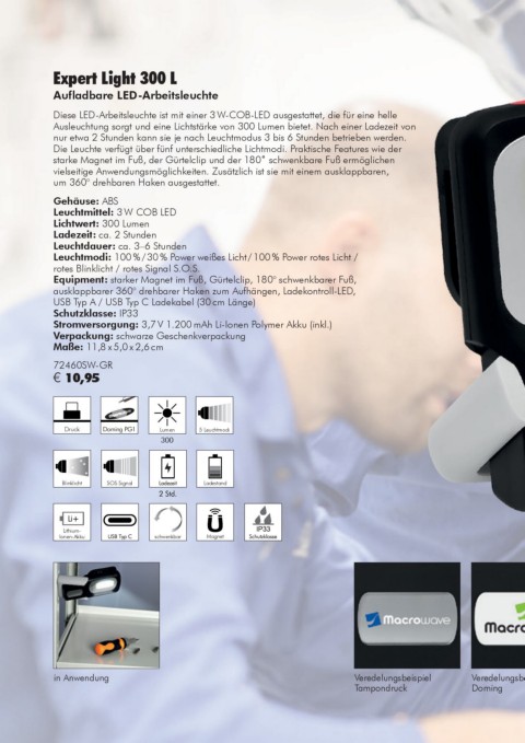 Ausleuchtung sorgt und eine Lichtstärke von 300 Lumen bietet. Nach einer Ladezeit von