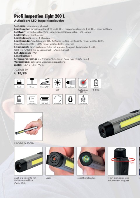 Lichtwert: Arbeitsleuchte 200 Lumen, Inspektionsleuchte 100 Lumen