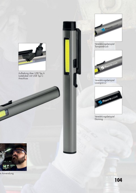 Equipment: 120° drehbarer Clip mit starkem Magnet, Ladekontroll-LED, Tampondruck