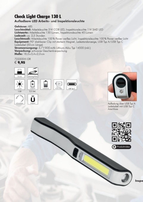 Lichtwerte: Arbeitsleuchte 130 Lumen, Inspektionsleuchte 40 Lumen