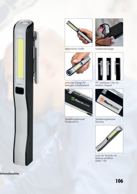 Leuchtmodi: Arbeitsleuchte 100 % Power weißes Licht, Inspektionsleuchte 100 % Power weißes Licht