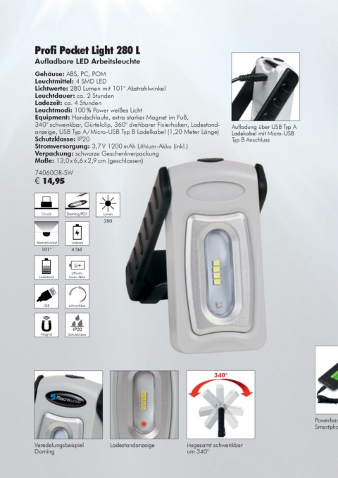 Equipment: Handschlaufe, extra starker Magnet im Fuß, Equipment: extra starker Magnet im Fuß, 180° schwenkbar, Gürtelclip,