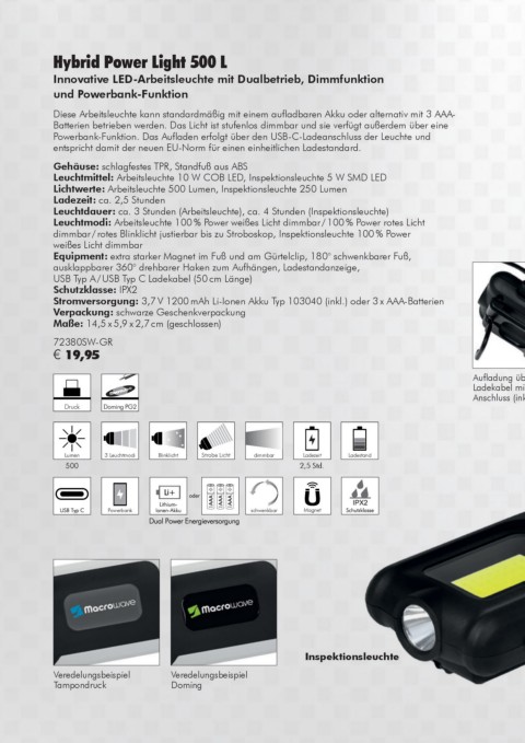 Lichtwerte: Arbeitsleuchte 500 Lumen, Inspektionsleuchte 250 Lumen