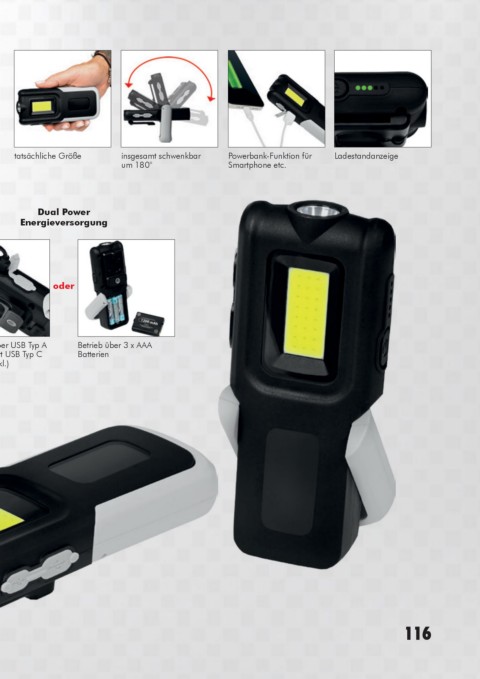 Lichtwerte: Arbeitsleuchte 500 Lumen, Inspektionsleuchte 250 Lumen