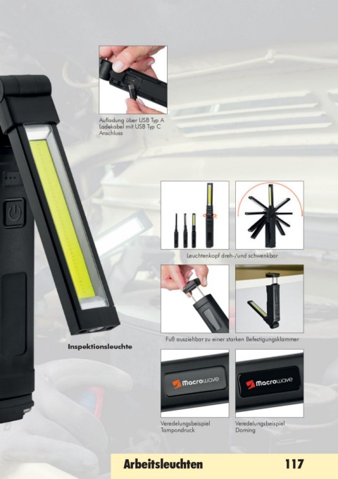 Leuchtmittel: Arbeitsleuchte 10 W COB LED, Inspektionsleuchte 5 W SMD LED Aufladung über USB Typ A