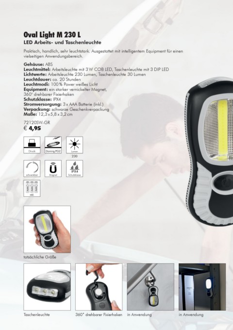 Lichtwerte: Arbeitsleuchte 230 Lumen, Taschenleuchte 30 Lumen