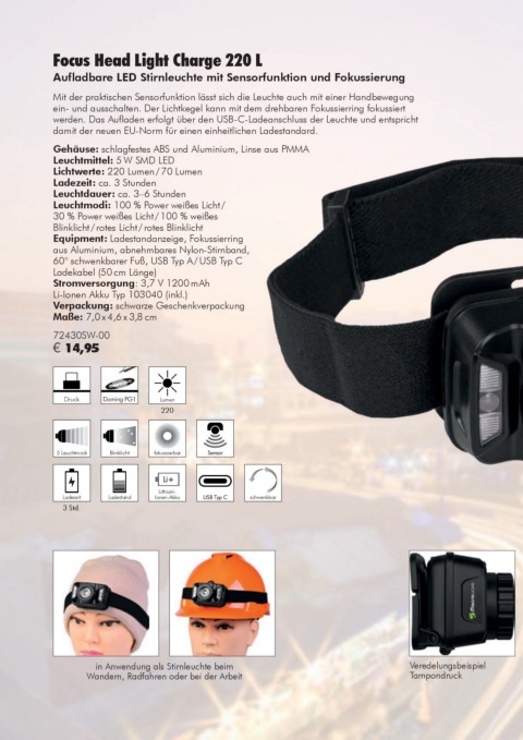 Lichtwerte: 220 Lumen / 70 Lumen Aufladung über USB Typ A