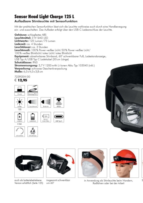 auch als batteriebetriebene insgesamt schwenkbar in Anwendung als Stirnleuchte beim Wandern, Sensorfunktion Leuchte kann auch ohne Veredelungsbeispiel Veredelungsbeispiel