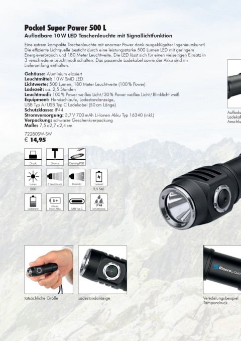 Lichtwerte: 500 Lumen, 180 Meter Leuchtweite (100 % Power)