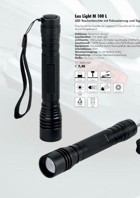 Lichtwerte: 100 Lumen, 50 Meter Leuchtweite (100 % Power)