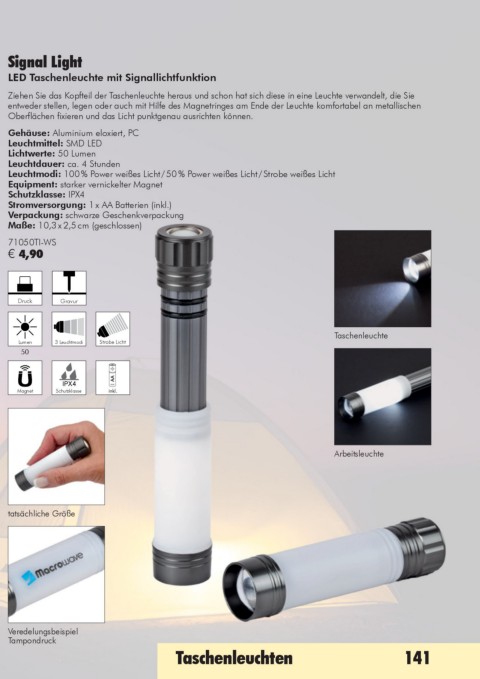 Leuchtmodi: 100 % Power weißes Licht / 50 % Power weißes Licht / Lichtwerte: 50 Lumen