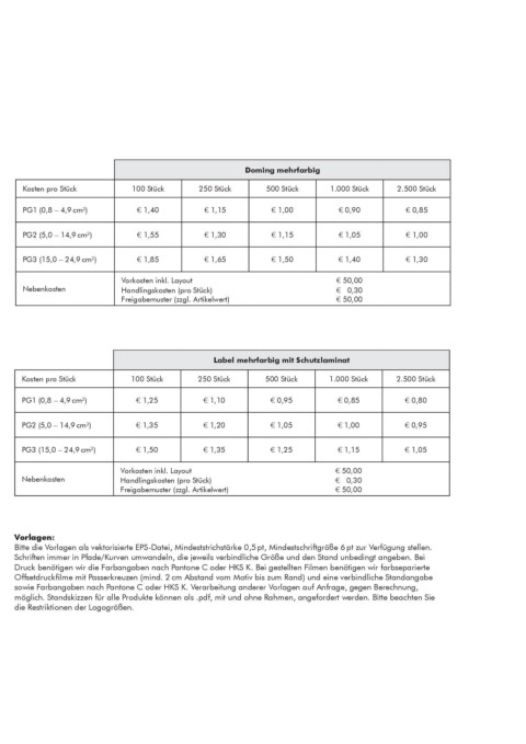 Rüstkosten pro Seite/Logo € 45,00 PG2 (5,0 – 14,9 cm²) € 1,35 € 1,20 € 1,05 € 1,00 € 0,95
