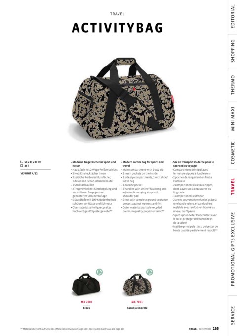 ** Materialübersicht auf Seite 184 | Material overview on page 184 | Aperçu des matériaux à la page 184 TRAVEL reisenthel 165