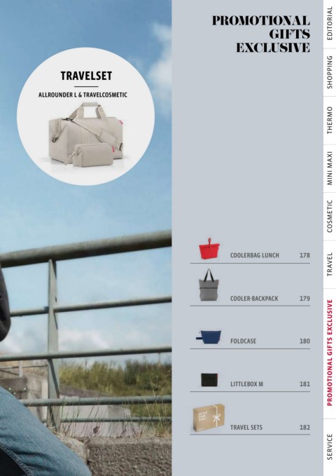 EDITORIAL PROMOTIONAL GIFTS EXCLUSIVE SHOPPING TRAVELSET ALLROUNDER L & TRAVELCOSMETIC THERMO MINI MAXI COSMETIC COOLERBAG LUNCH 178 TRAVEL COOLER-BACKPACK 179 FOLDCASE 180 PROMOTIONAL GIFTS EXCLUSIVE LITTLEBOX M 181 TRAVEL SETS 182 SERVICE