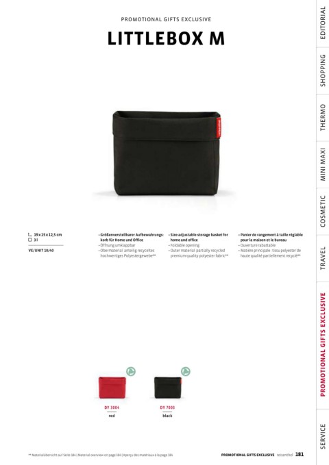 ** Materialübersicht auf Seite 184 | Material overview on page 184 | Aperçu des matériaux à la page 184 PROMOTIONAL GIFTS EXCLUSIVE reisenthel 181