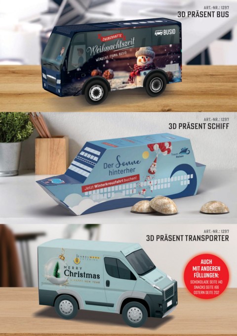 ART.-NR.: 1297 3D PRÄSENT BUS ART.-NR.: 1297 3D PRÄSENT SCHIFF ART.-NR.: 1297 3D PRÄSENT TRANSPORTER Auch mit anderen Füllungen: Schokolade Seite 140 Snacks Seite 166 Ostern Seite 202